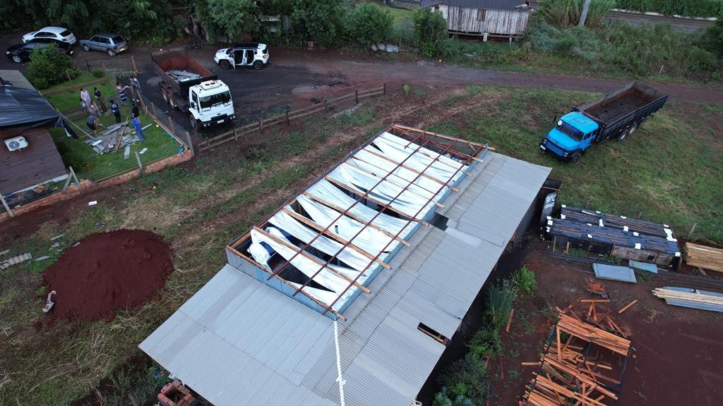 Imagens aéreas divulgadas pela Defesa Civil mostram os estragos causados pelo temporal registrado na tarde de segunda-feira, dia 16, em São Domingos, no Oeste catarinense. Os ventos fortes destelharam casas e deixaram moradores desalojados, principalmente no bairro Miguel Abramo Pretto.