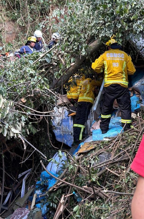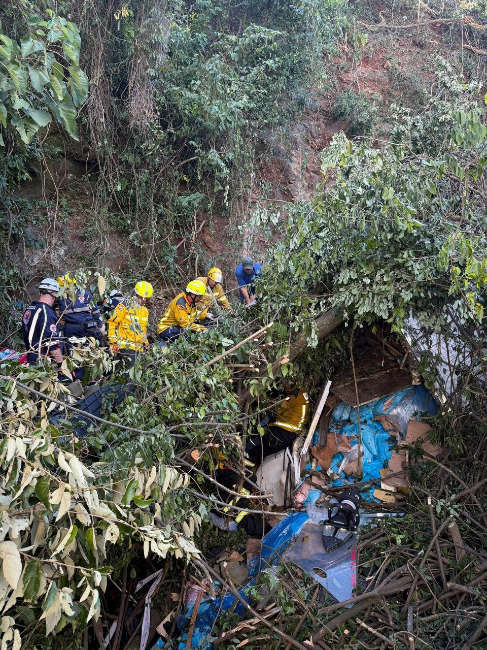 Resgate de motorista leva cerca de 5 horas após queda de caminhão em ribanceira