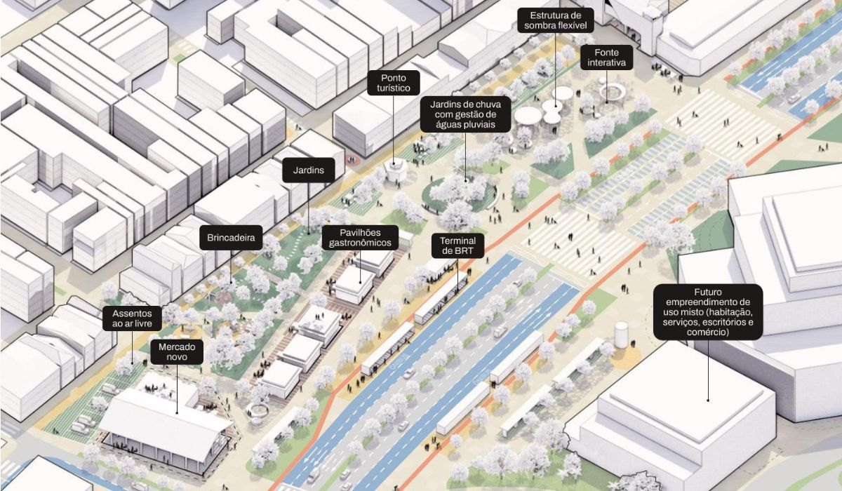 Na rua Francisco Tolentino, nas proximidades do Mercado Público, o projeto sugere a construção de uma praça, que envolveria grandes modificações na região. O camelódromo, por exemplo, poderia ser transferido para um novo espaço. A medida poderia auxiliar na redução das ilhas de calor.