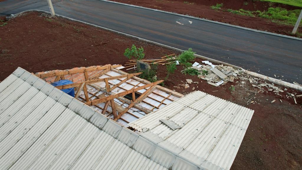 Imagens aéreas divulgadas pela Defesa Civil mostram os estragos causados pelo temporal registrado na tarde de segunda-feira, dia 16, em São Domingos, no Oeste catarinense. Os ventos fortes destelharam casas e deixaram moradores desalojados, principalmente no bairro Miguel Abramo Pretto.
