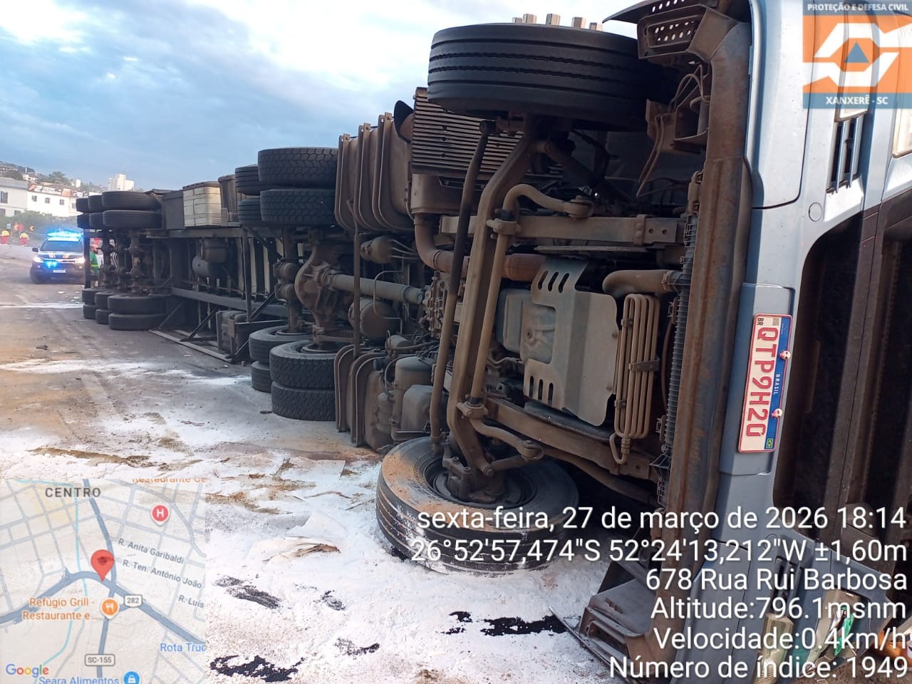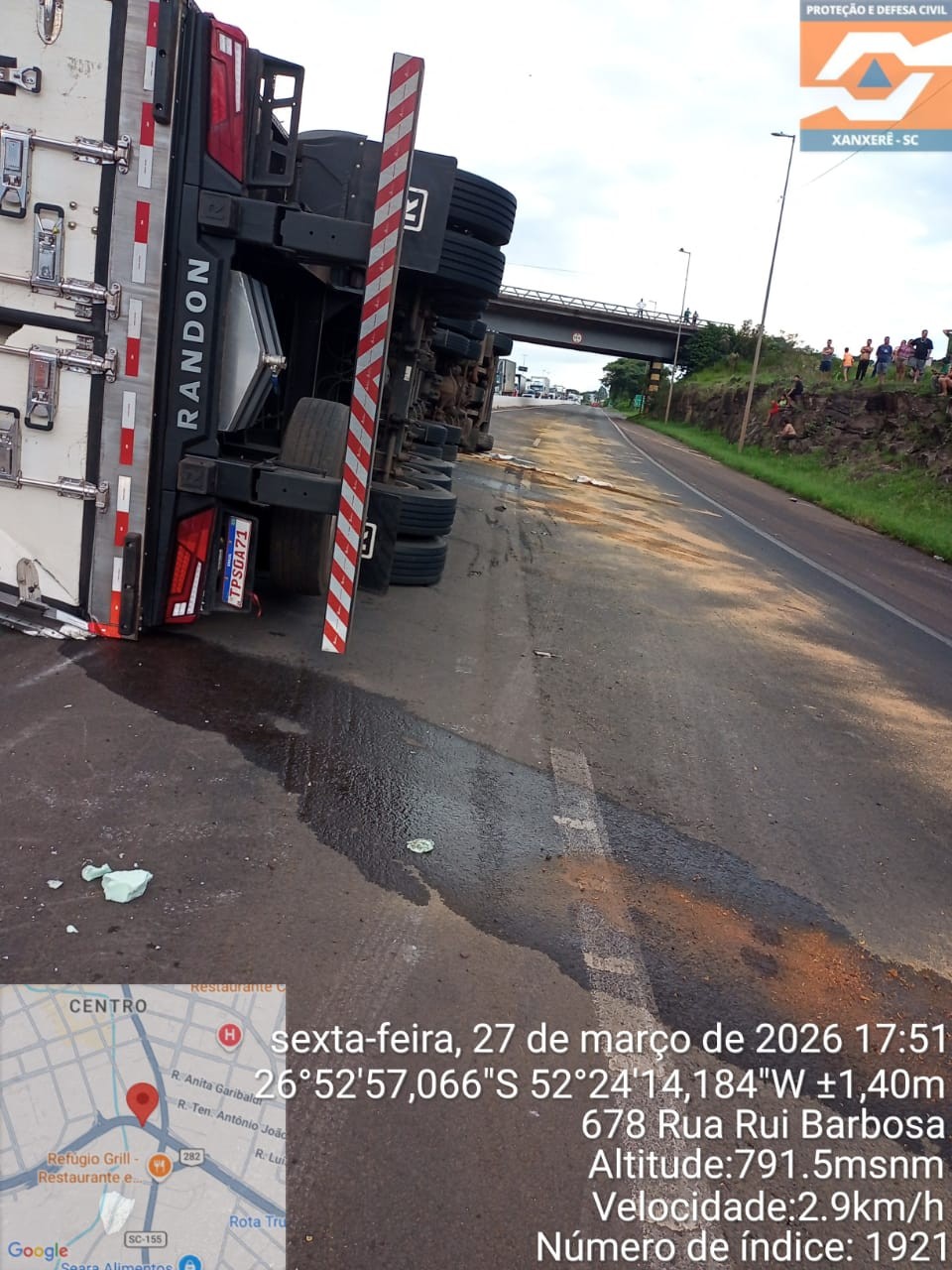 Uma carreta carregada com cortes de carne congelados tombou na tarde desta sexta-feira, dia 27, na BR-282, em Xanxerê, no Oeste catarinense.