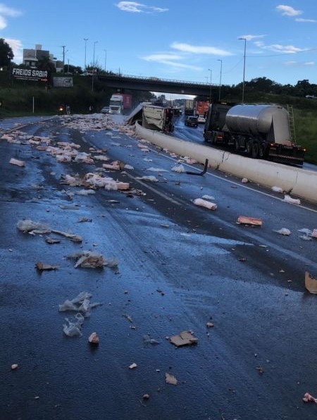 O acidente foi registrado às 16h51, na curva do viaduto. Imagens que circulam nas redes sociais mostram o momento em que o veículo perde o controle e tomba ao fazer a curva. Com o impacto, a carga ficou espalhada sobre a pista e parte dos produtos foi saqueada por pessoas que estavam no local.