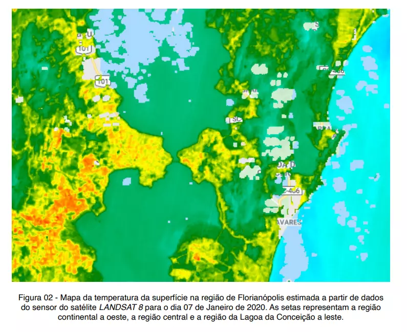 Já em relação às temperaturas mais frias, foram verificadas na região da Lagoa da Conceição, no Leste da Ilha, com 29°C, também em 7 de janeiro de 2020. Conforme o estudo, as ilhas podem ocorrer devido à diferença do tipo de superfícies das regiões.