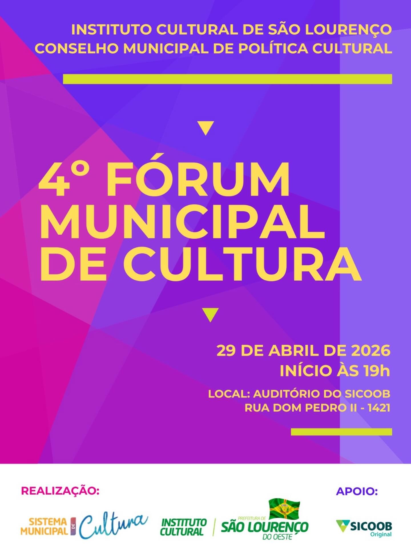 O ICSL, em parceria com o Conselho Municipal de Política Cultural, realizará no dia 29 de abril o 4º Fórum Municipal de Cultura